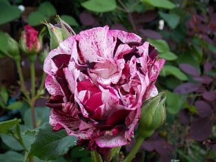 Ich habe diese Rose in 10 gemischten Beetrosen Sorten bekommen. Überraschend schöne dunkle violette Farbe mit weißen Streifen und mildem Duft. Sie hat wirklich gesunde Laub. Diese Rose darf in keinem Garten fehlen.