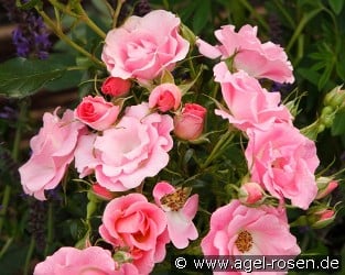 Roselina ist eine dicht- und breitbuschig wachsende Beetrose. Die leicht gefüllten zartrosa Blüten, die in zahlreichen Dolden erscheinen, sind sehr regenfest und halten auch Hitze gut aus.